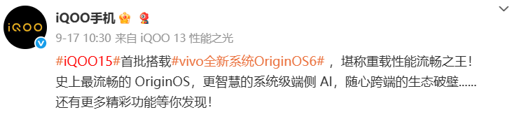 iQOO 15搭载高通骁龙8 Elite Gen 5移动平台,并配备自研Q3电竞芯片。值得一提的是,作为行业首个集“全场景光线追踪+游戏超分+游戏超帧”于一体的独立显示芯片,自研电竞芯片Q3采用台积电超低功耗制程,性能提升60%、能效提升40%、缓存提升50%、AI算力提升400%。另外,iQOO 15还引入了Monster超核引擎,包含“先知调度器”和“闪电加速器”两大核心模块,并搭载全新系统OriginOS 6。